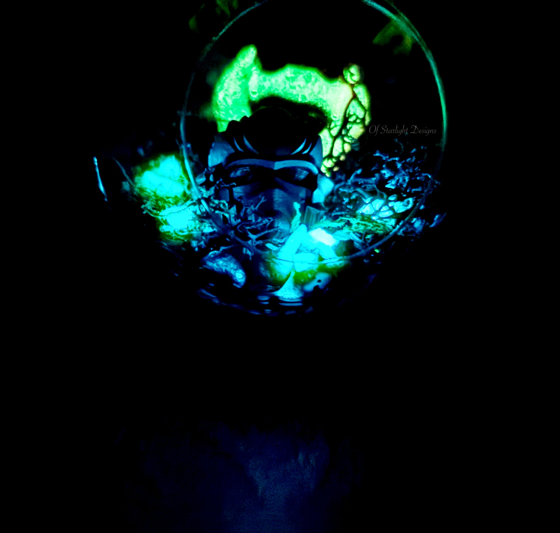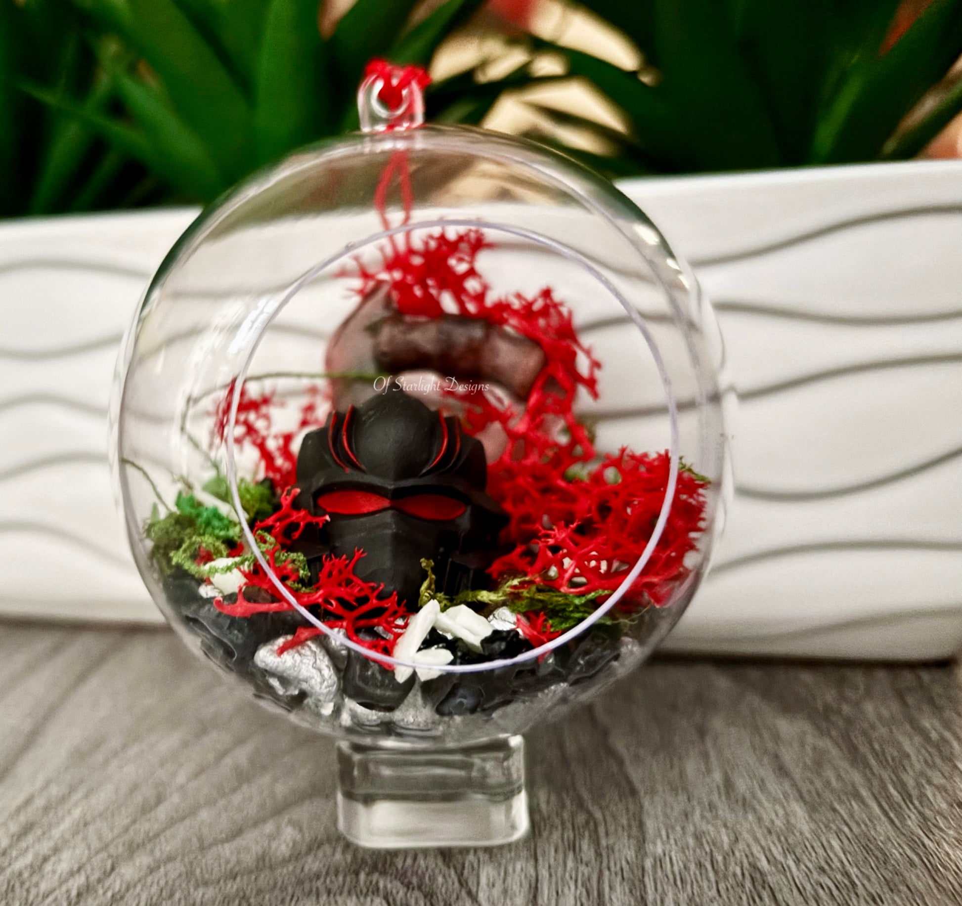 Premium acrylic orb with a Hayabusa helmet, resin glow in the dark energy sword, sand to look like dirt, faux moss, glow in the dark, black, and white rocks in the base. Everything is bonded down to prevent movement. Red string to hang with and glued shut.