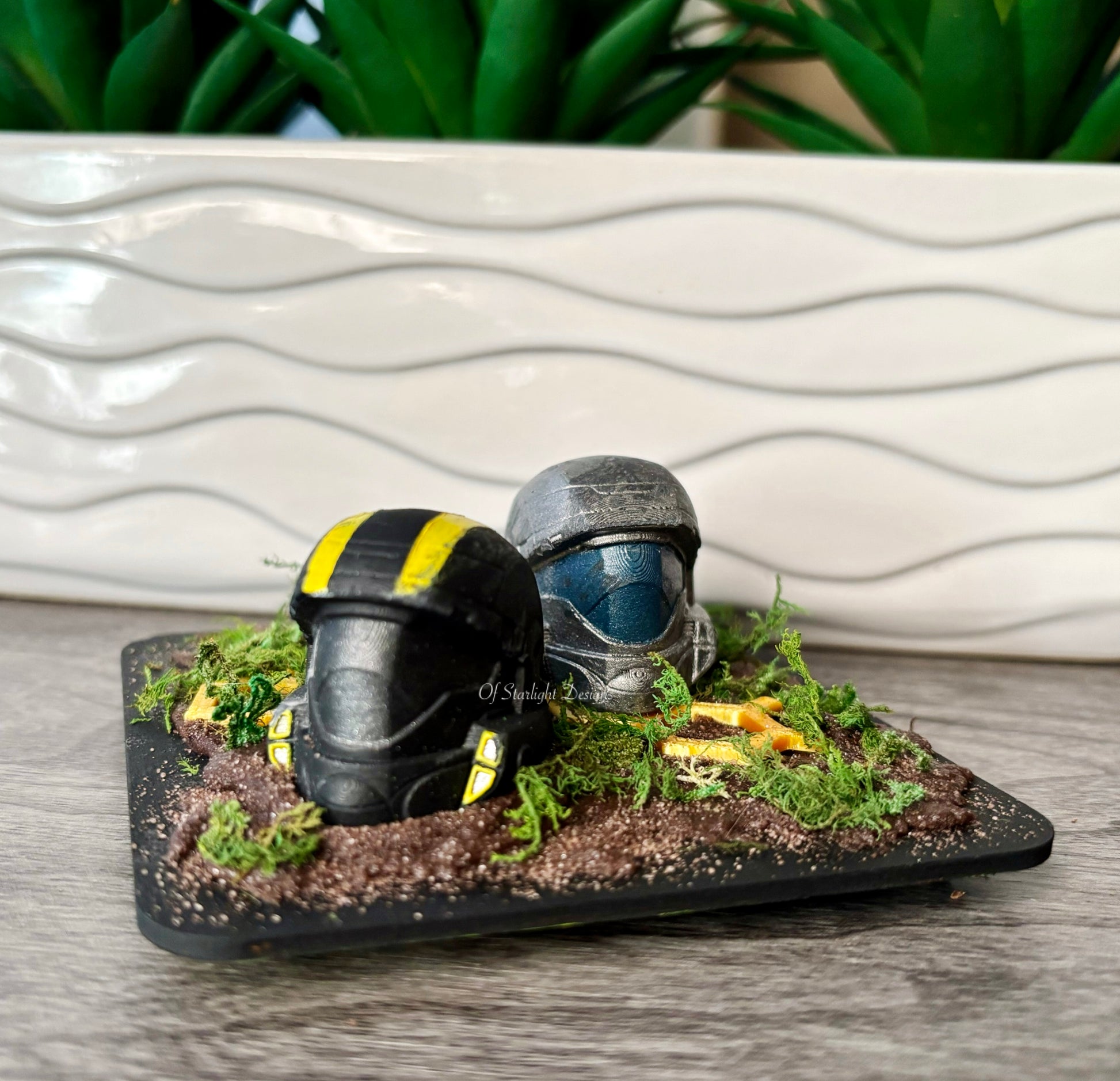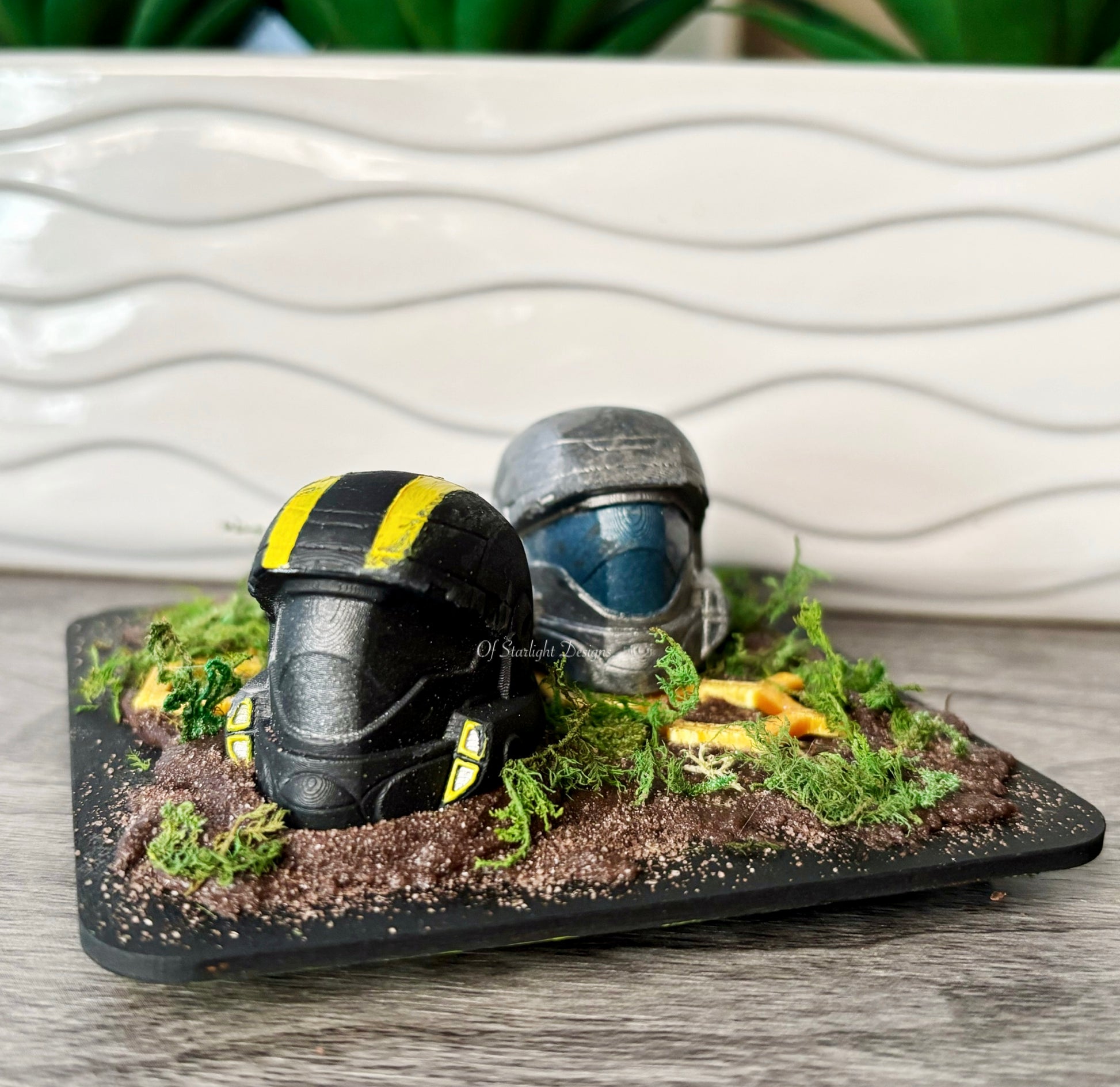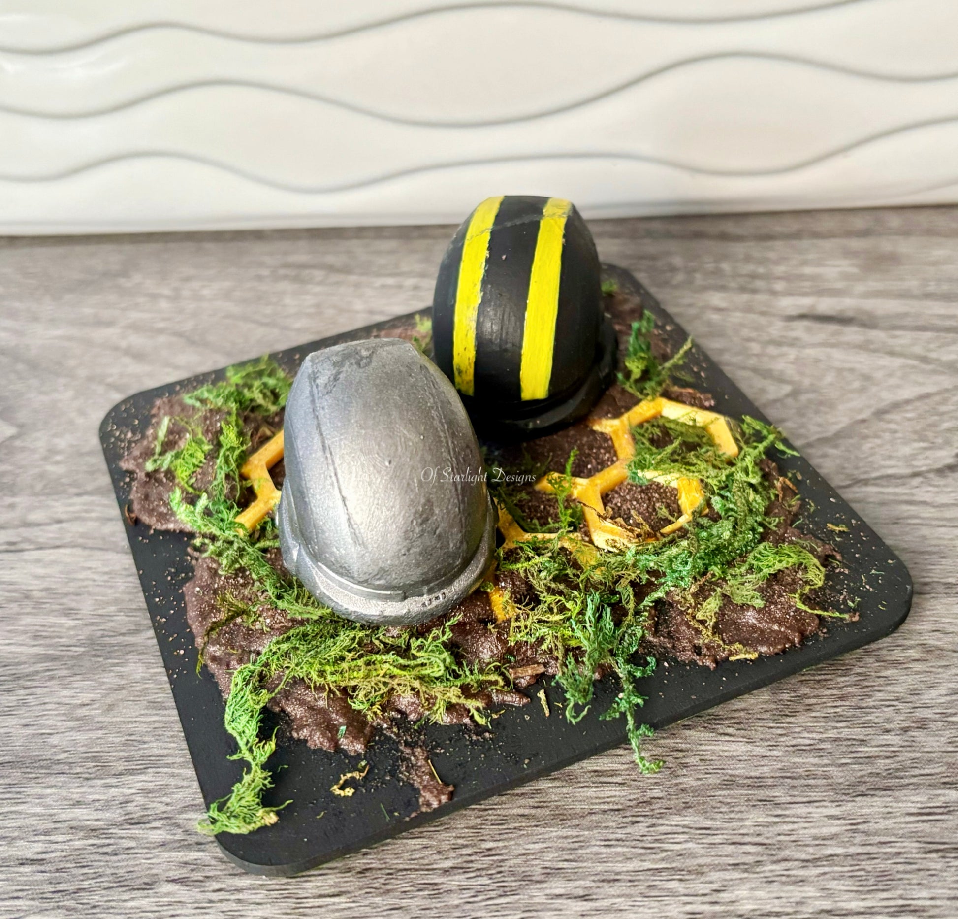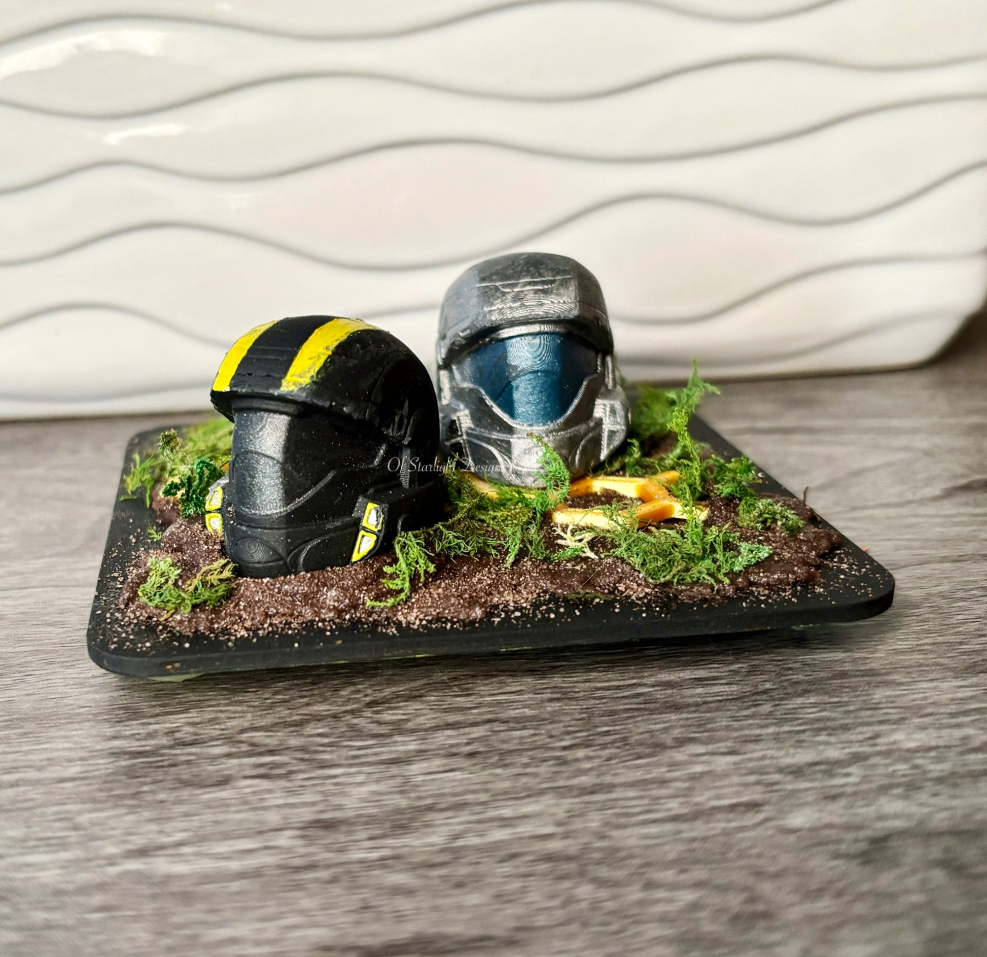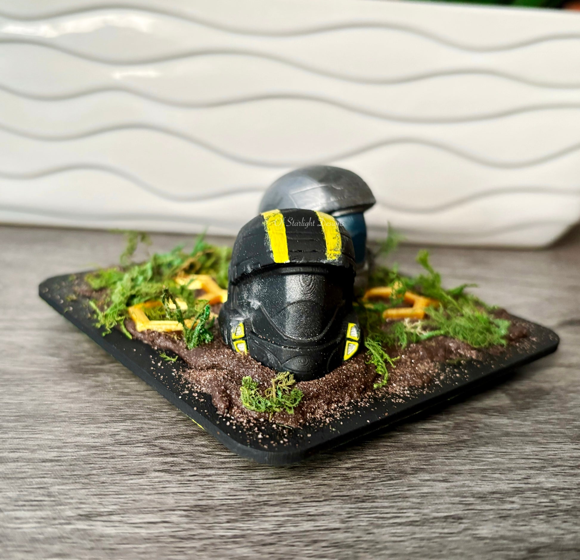Wooden base with a 2 ODST helmets, 3D printed honeycomb, faux moss and brown sand to look like dirt on the base.