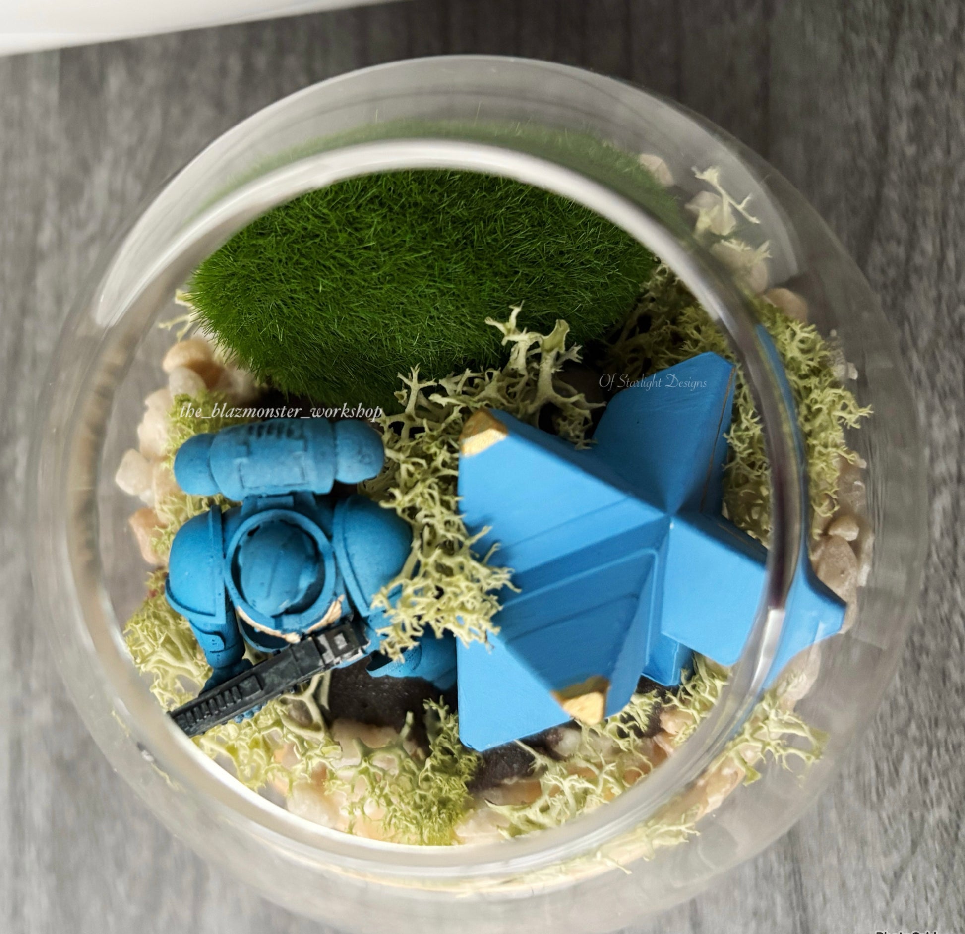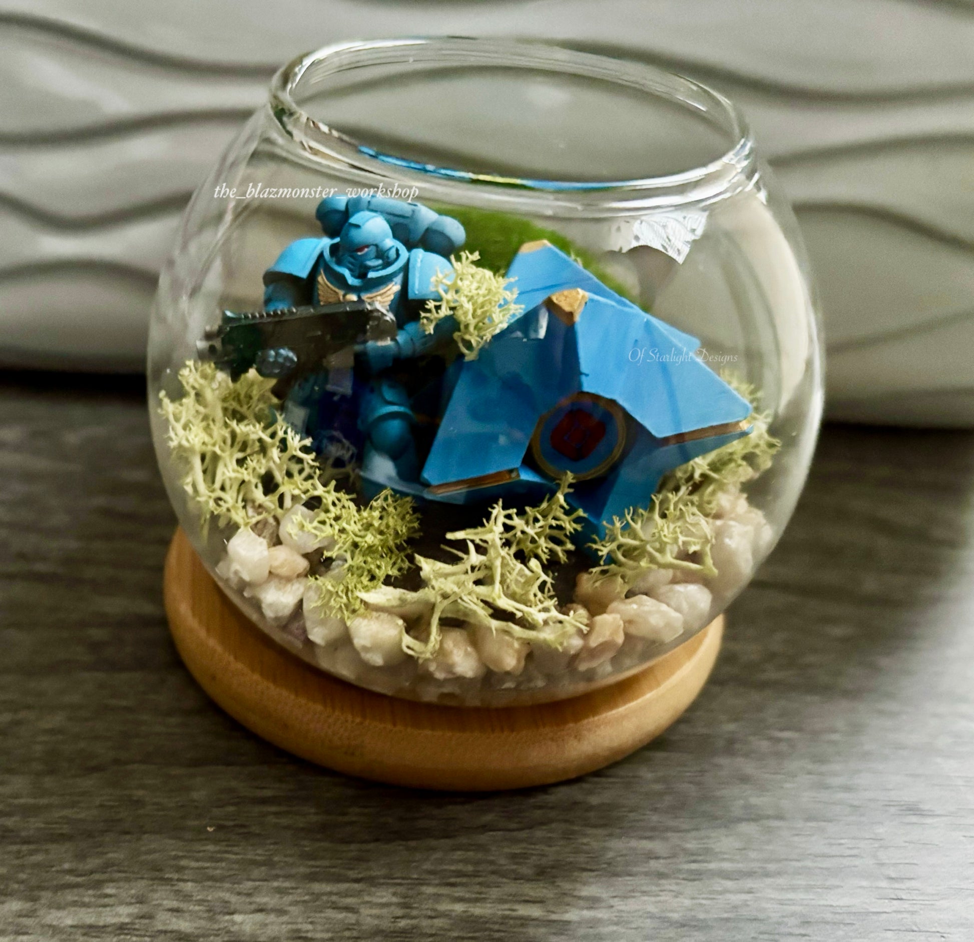 Glass orb with a little light, UM mini figure, faux moss and moss rock, and tan rocks on the base. Everything is bonded down to prevent movement.