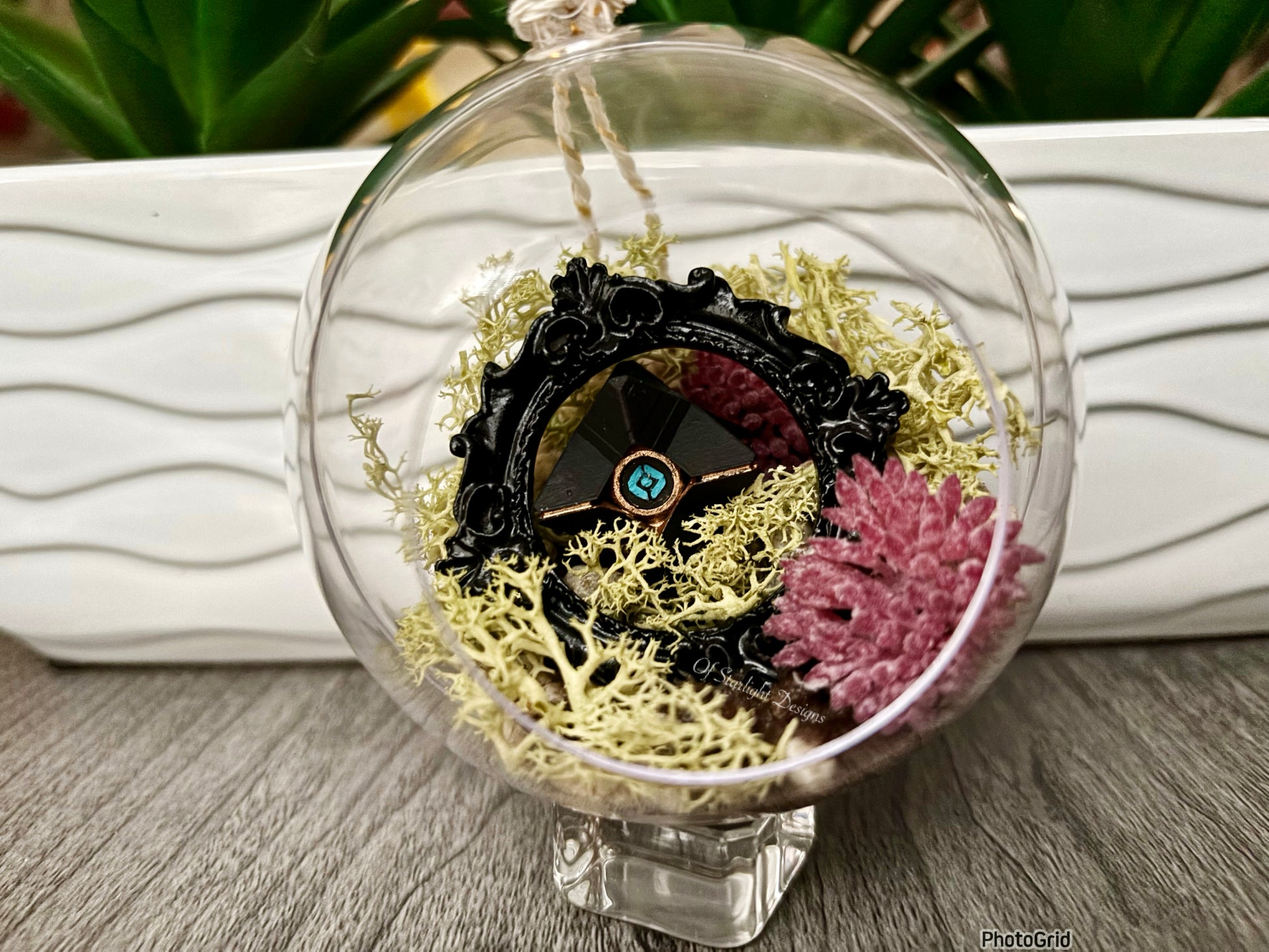 Premium acrylic orb a little light, purple plastic plants, mini black frame, brown sand to look like dirt, moss, tan rocks in the base. Everything is bonded down to prevent movement. Gold and white string to hang with and glued shut.
