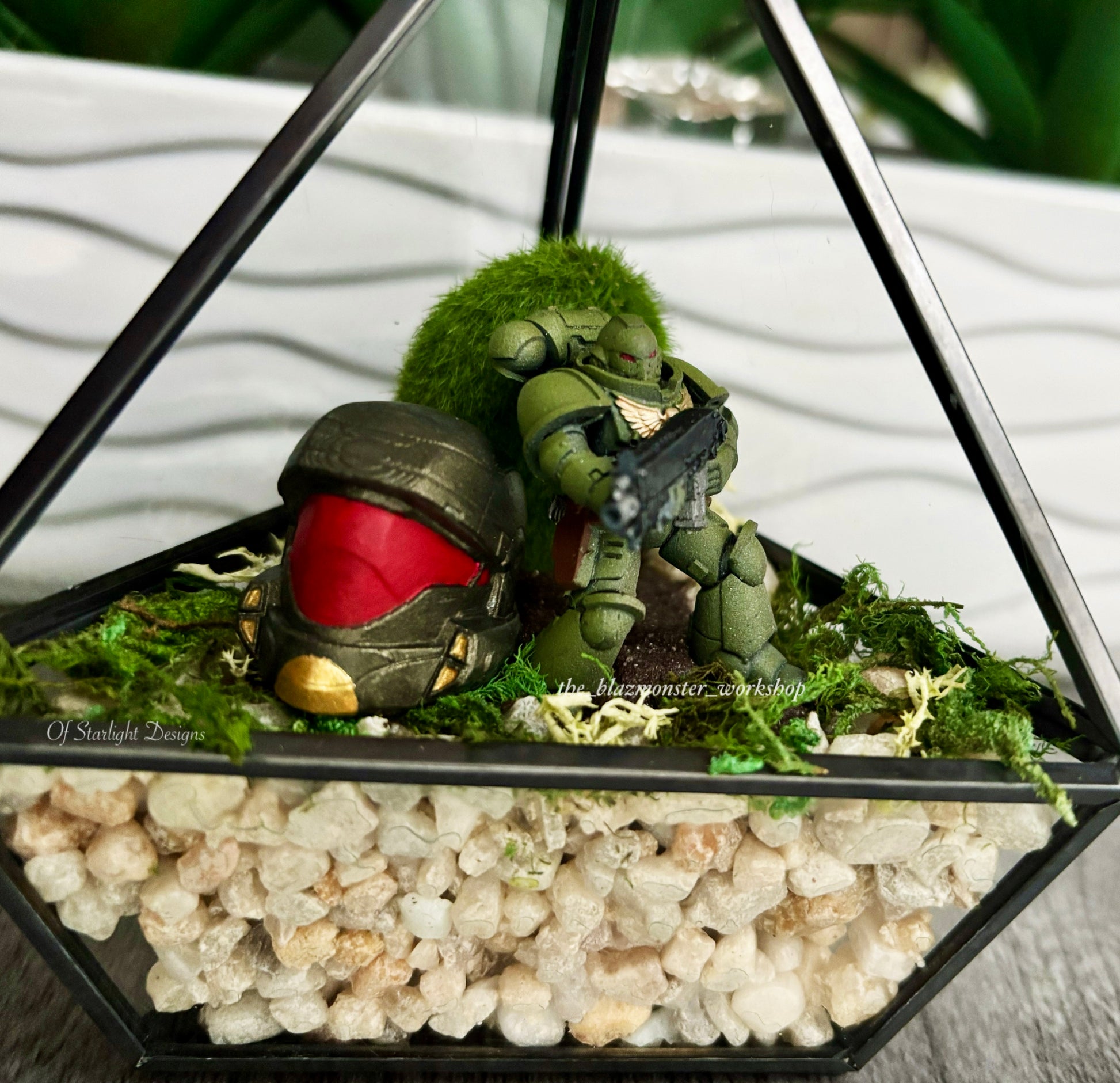 Metal terrarium with glass windows with an ODST helmet, Raptor painted mini figure, faux moss and moss rock, brown sand to look like dirt, and tan rocks in the base. Everything is glued down to prevent movement.