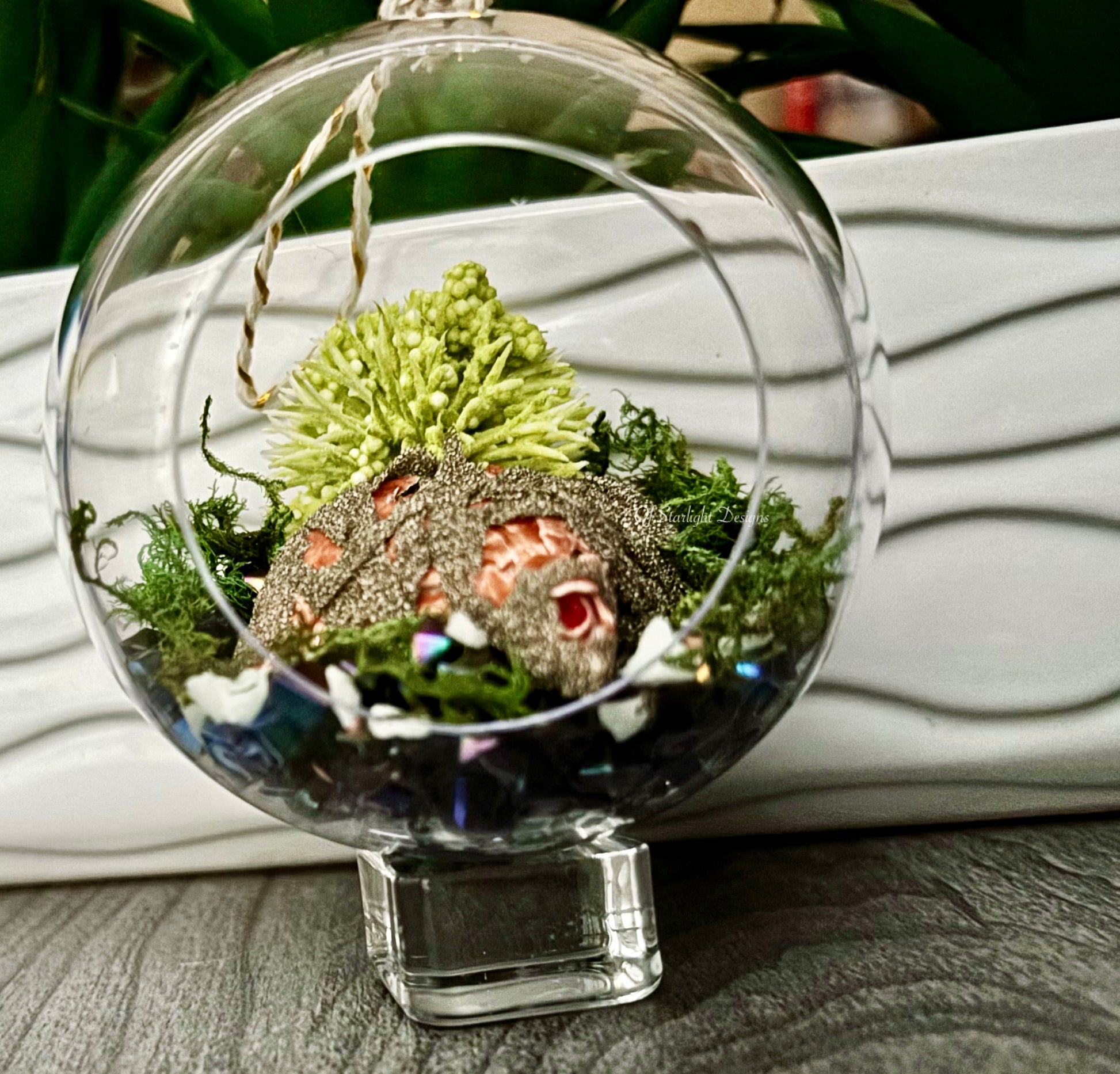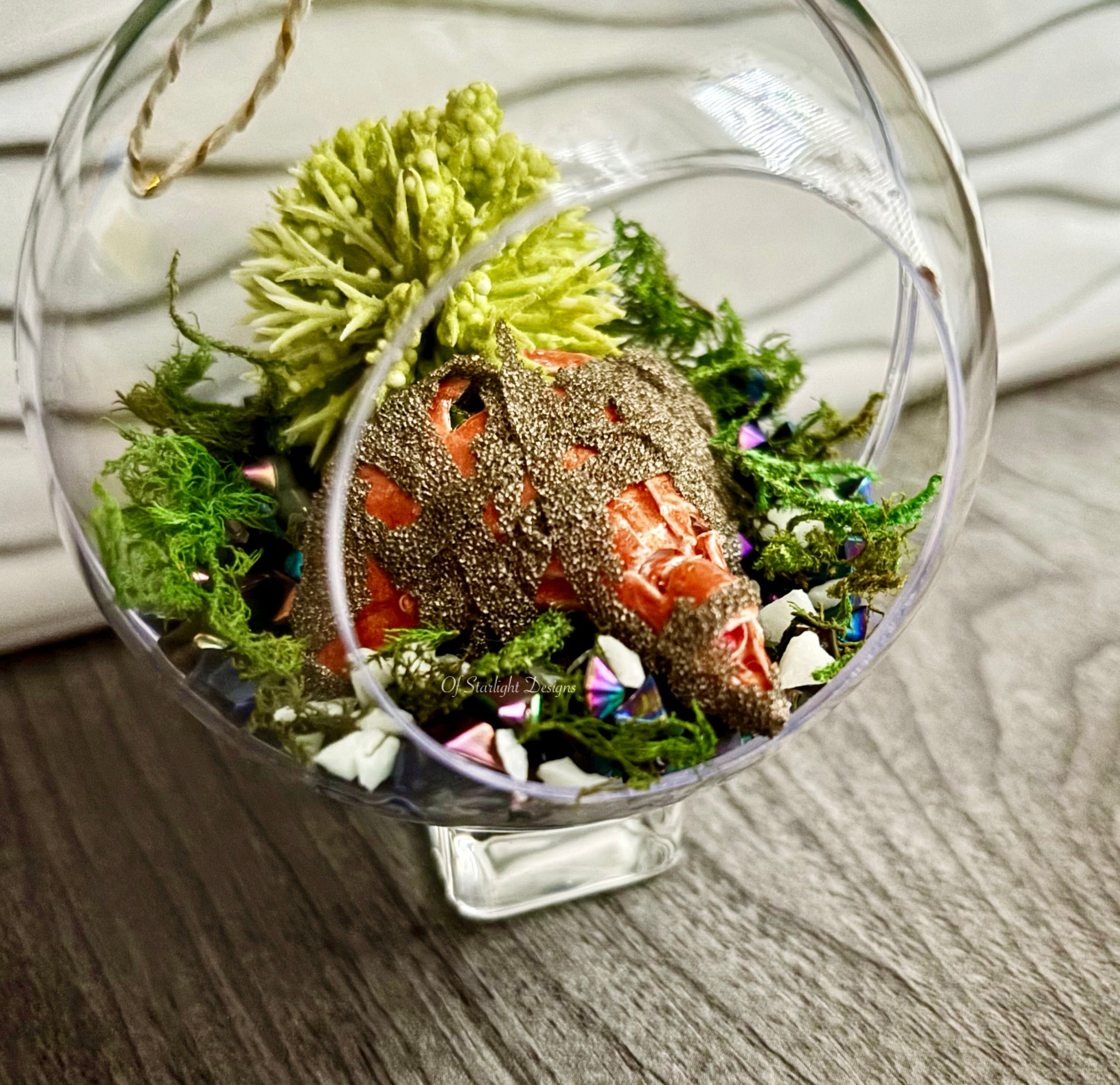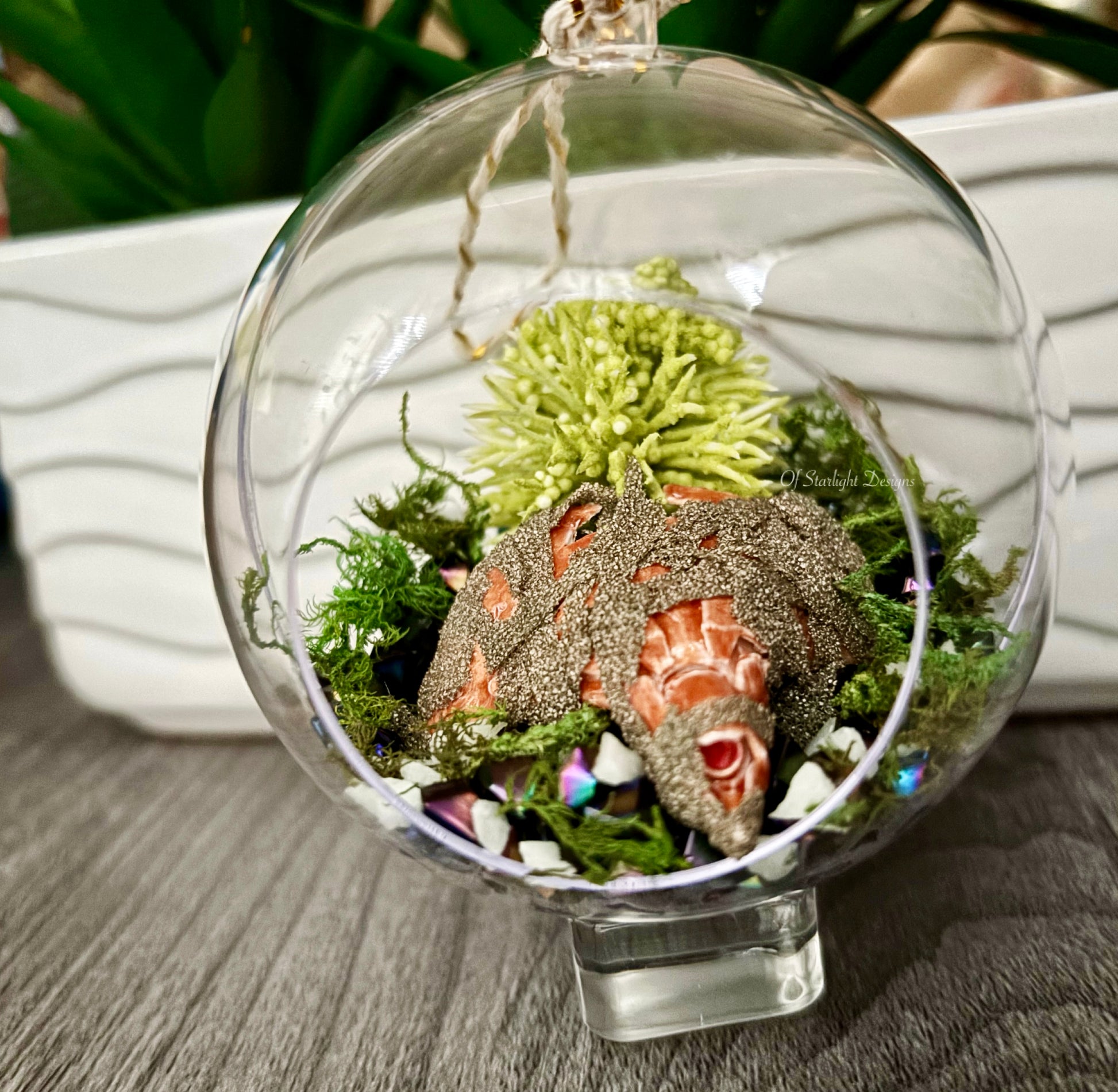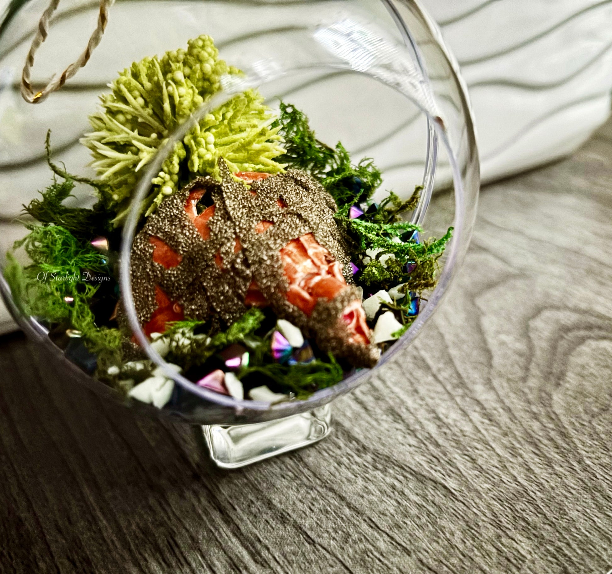 Premium acrylic orb with a Goblin head with "mummy wrappings", faux plants and moss, color shifting, black, and glow in the dark rocks on the base. Everything is bonded down to prevent movement. Gold and white string to hang with and glued shut.
