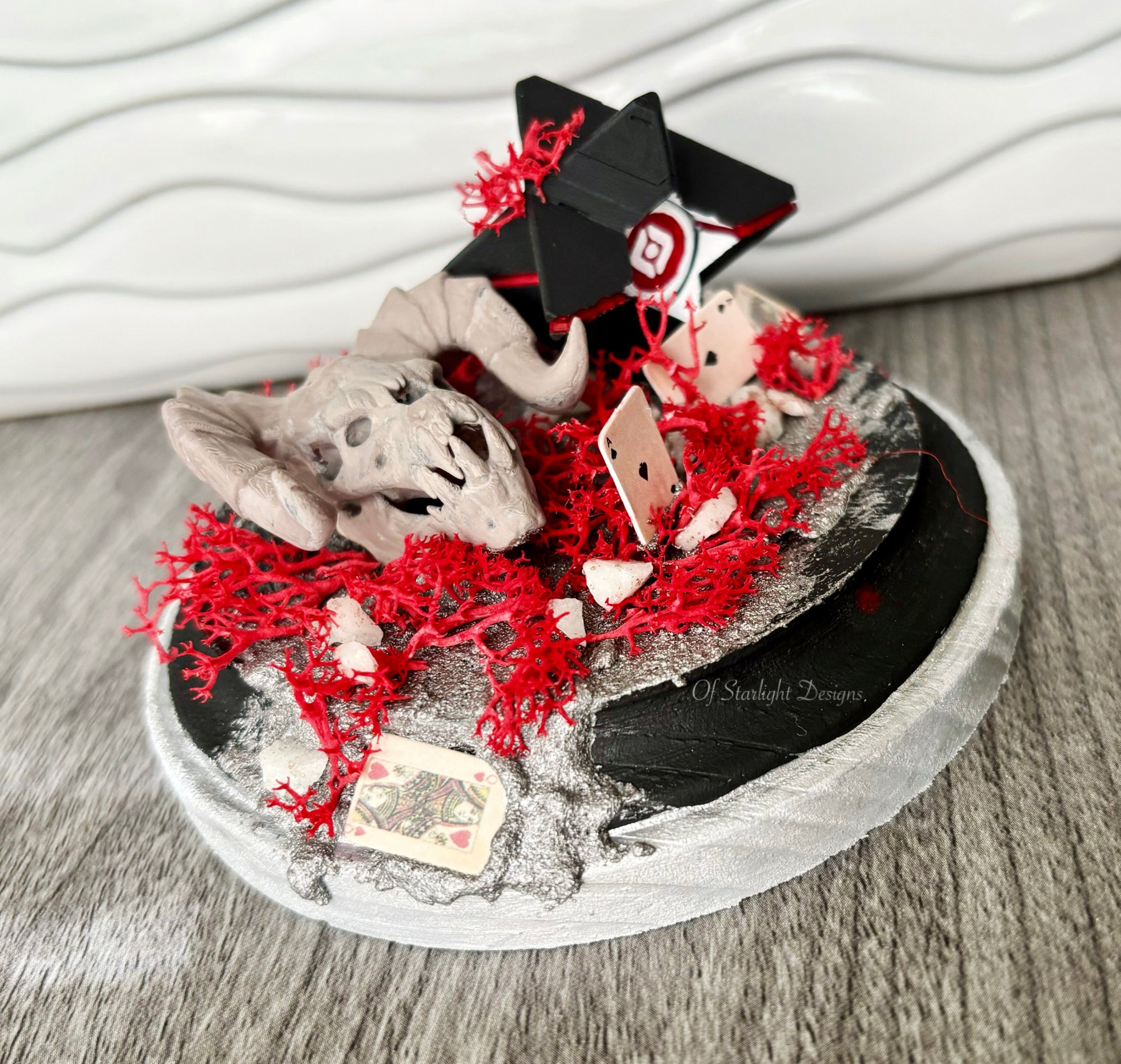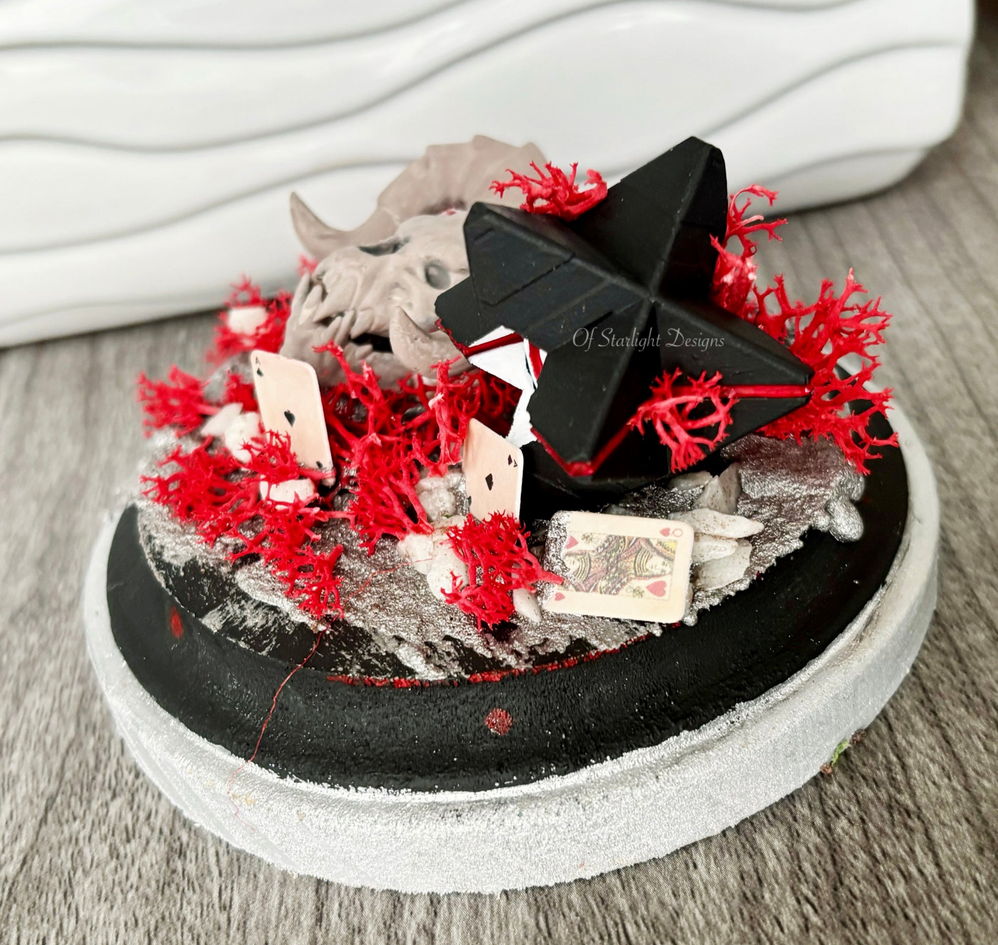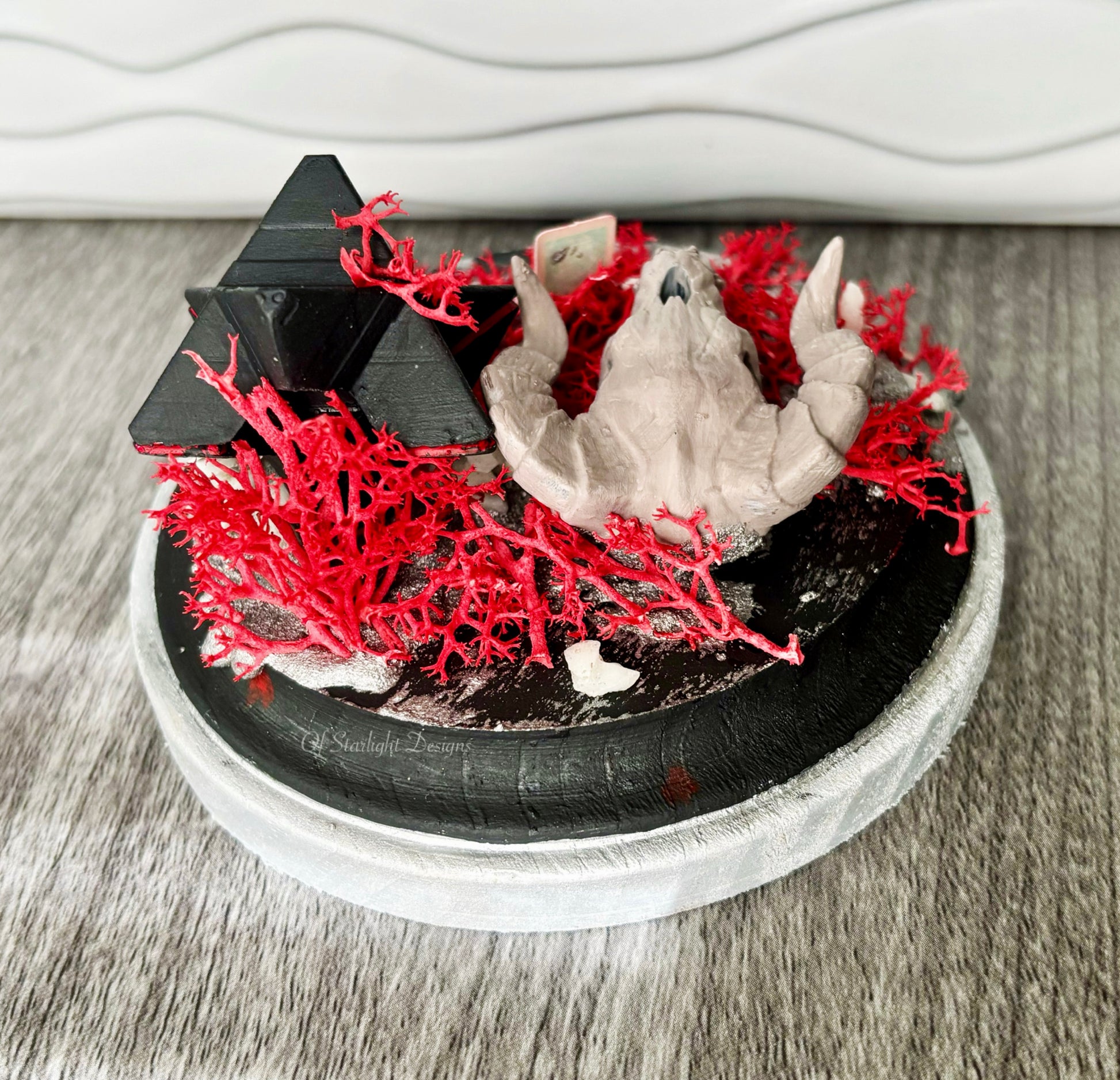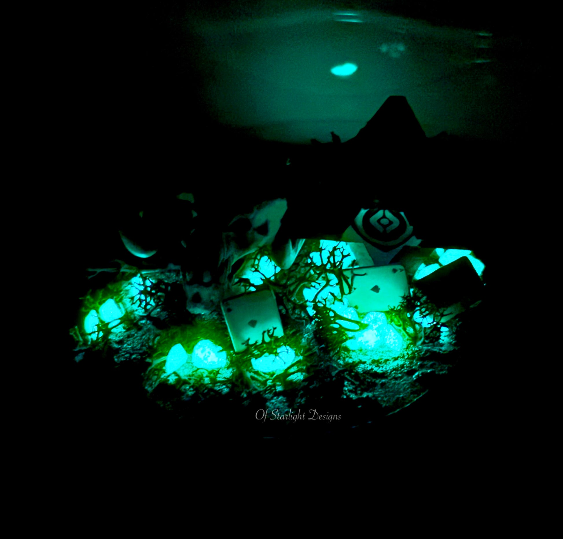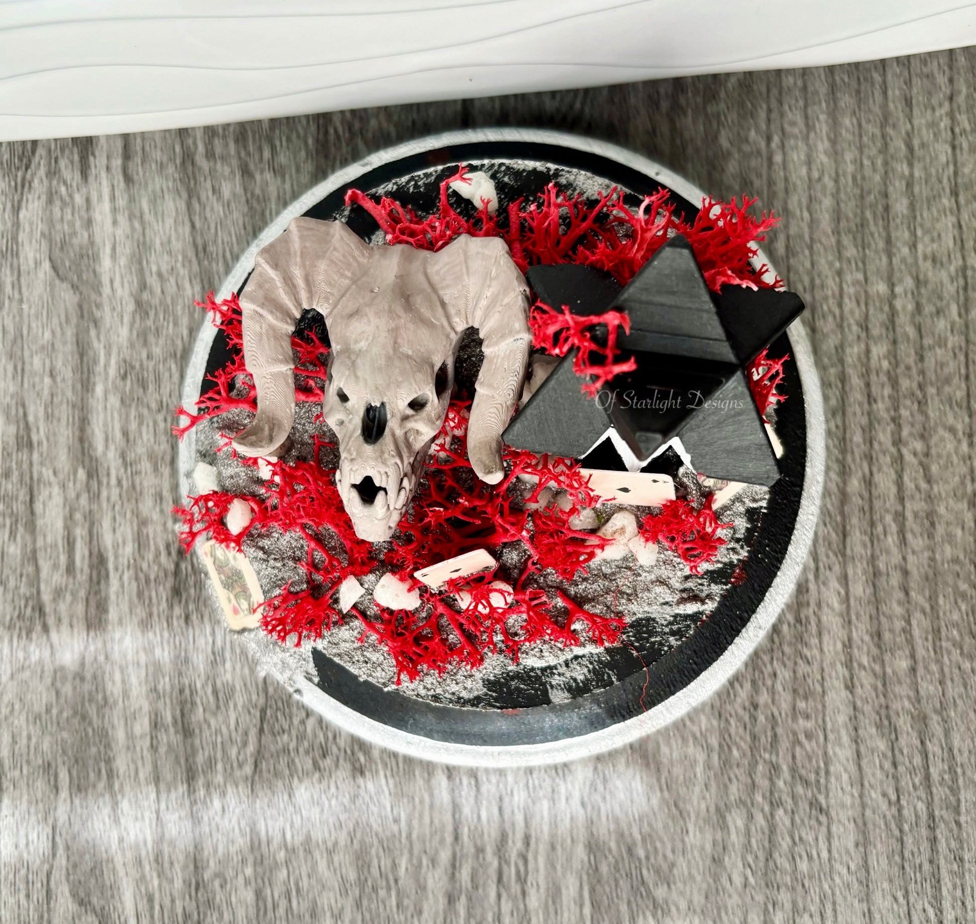 Wooden base with a deathclaw skull, little light, glow in the dark rocks, little cards, red moss, silver mix sand spread across the base. Everything is bonded down to prevent movement.