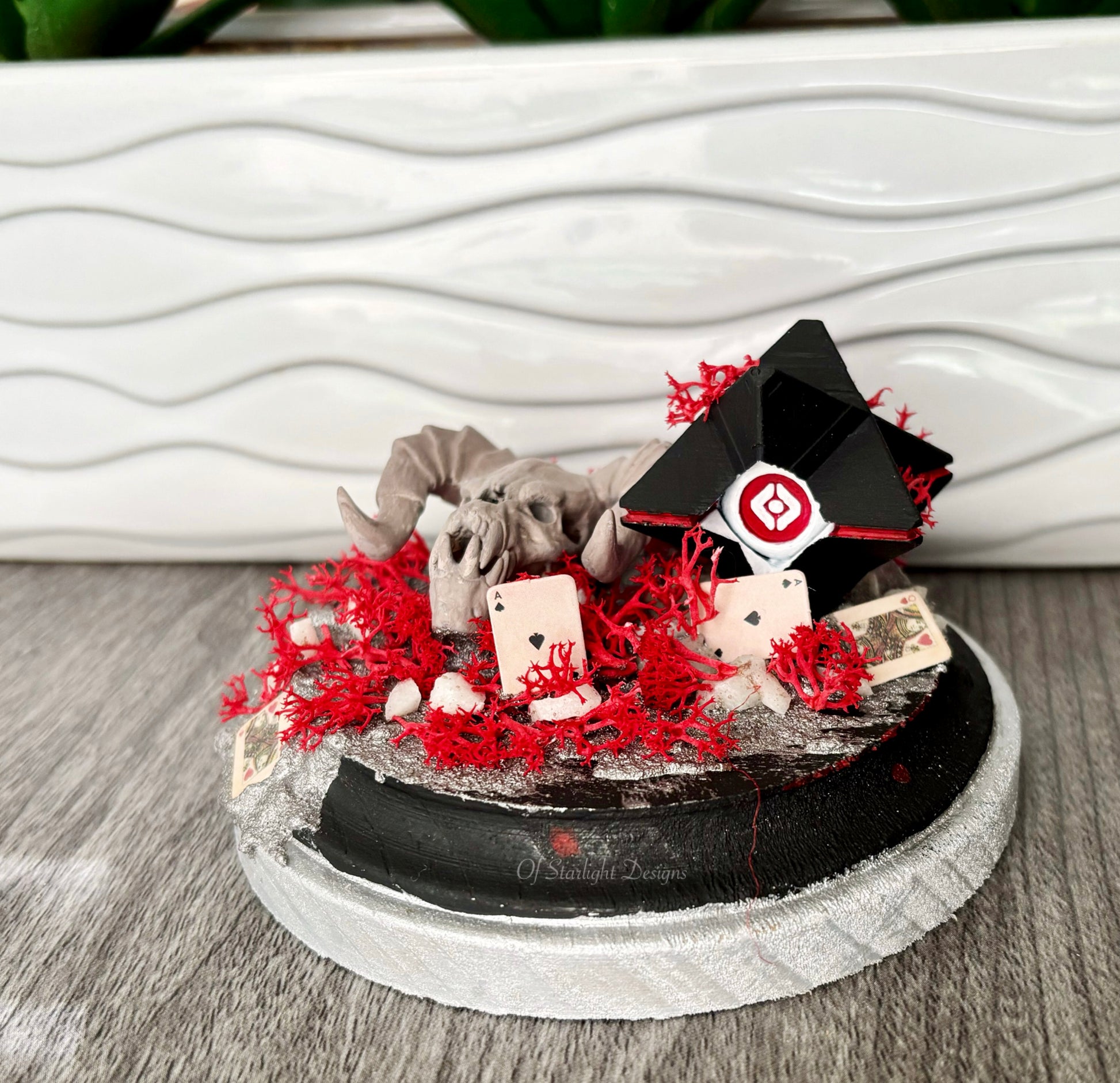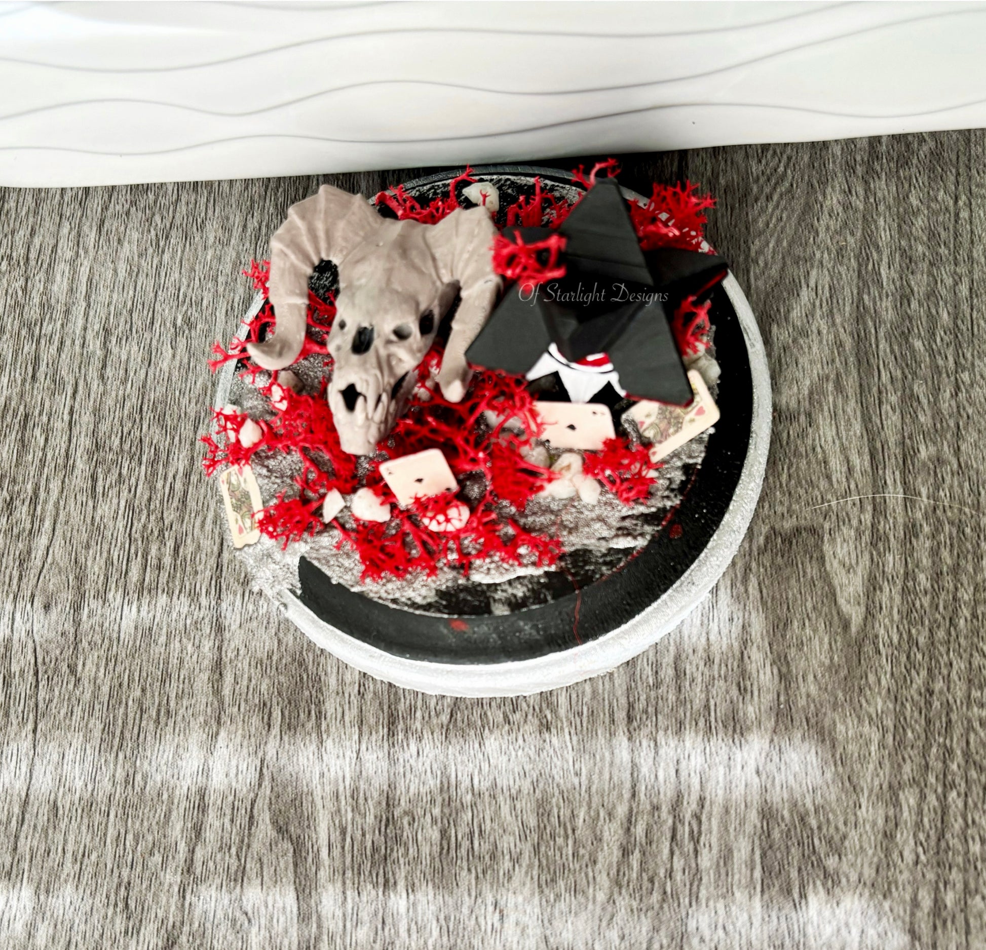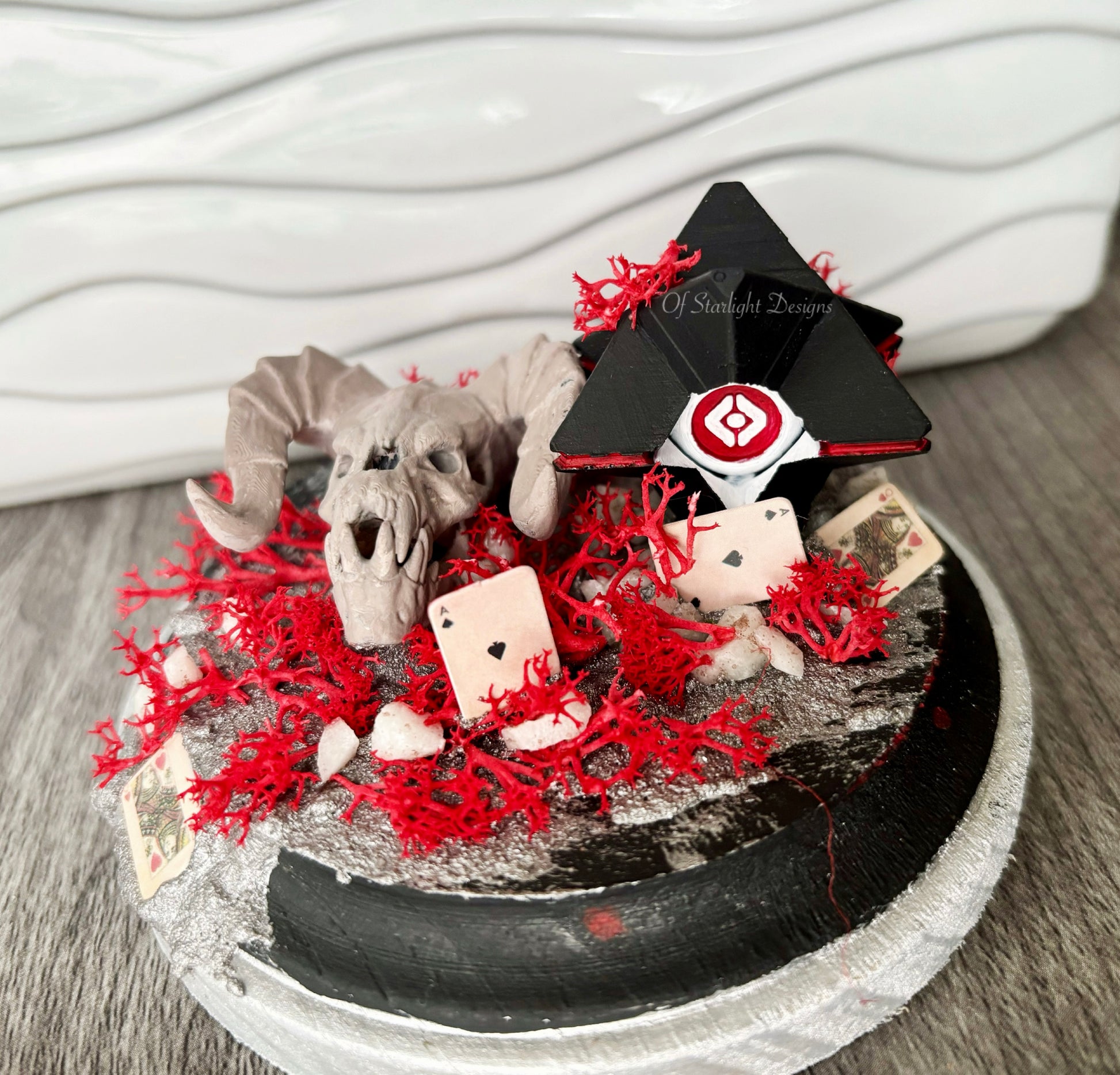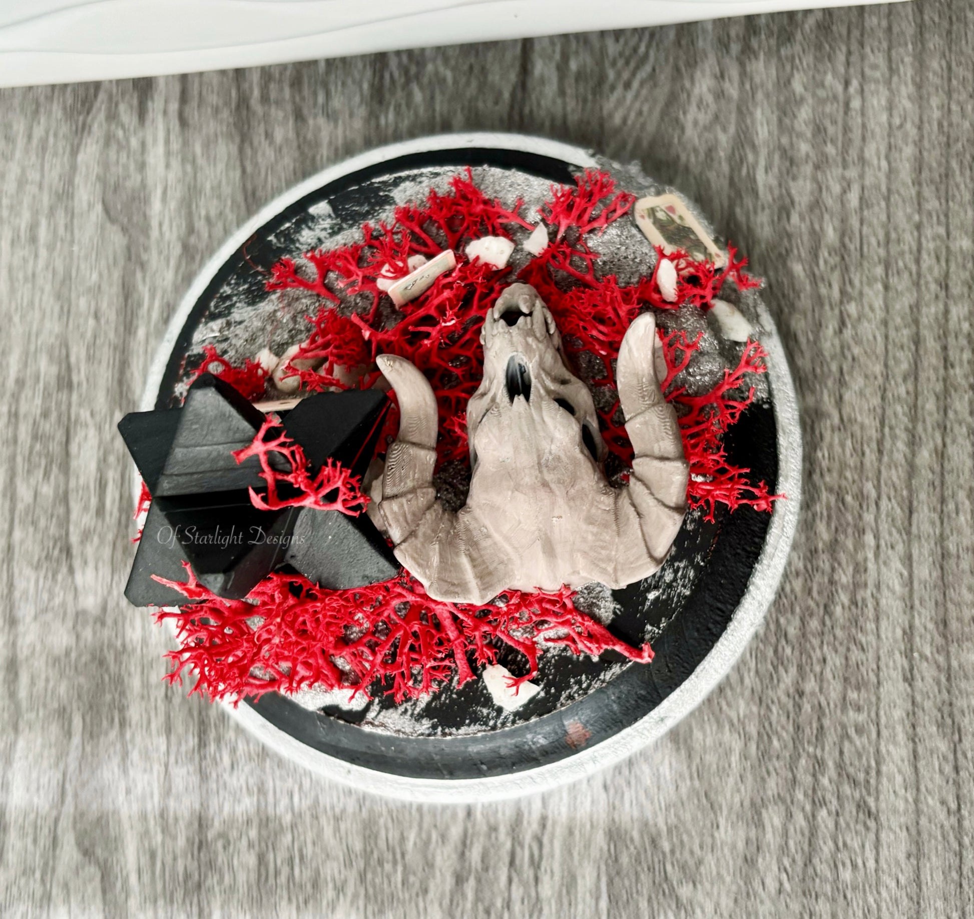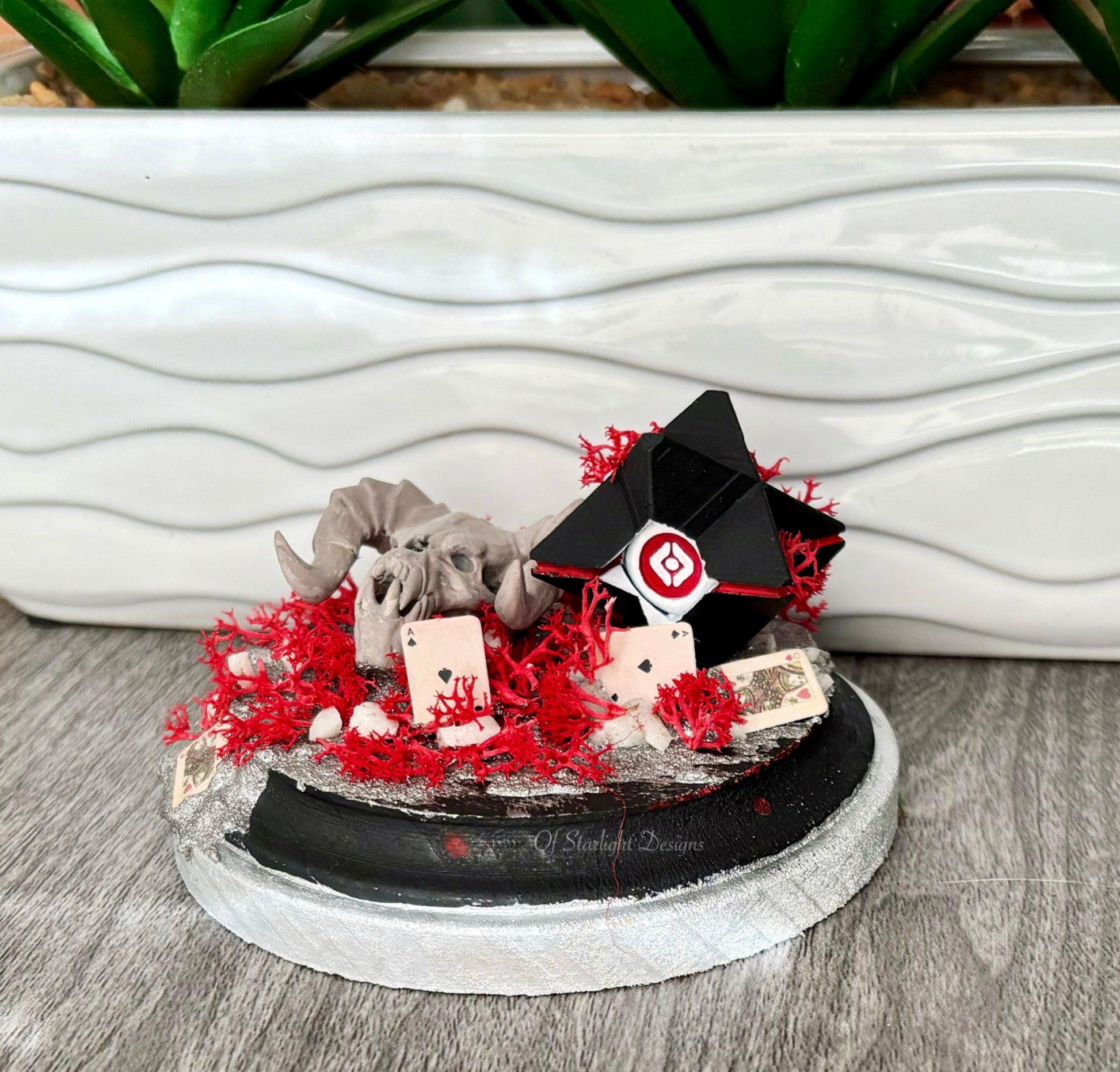 Wooden base with a deathclaw skull, little light, glow in the dark rocks, little cards, red moss, silver mix sand spread across the base. Everything is bonded down to prevent movement.