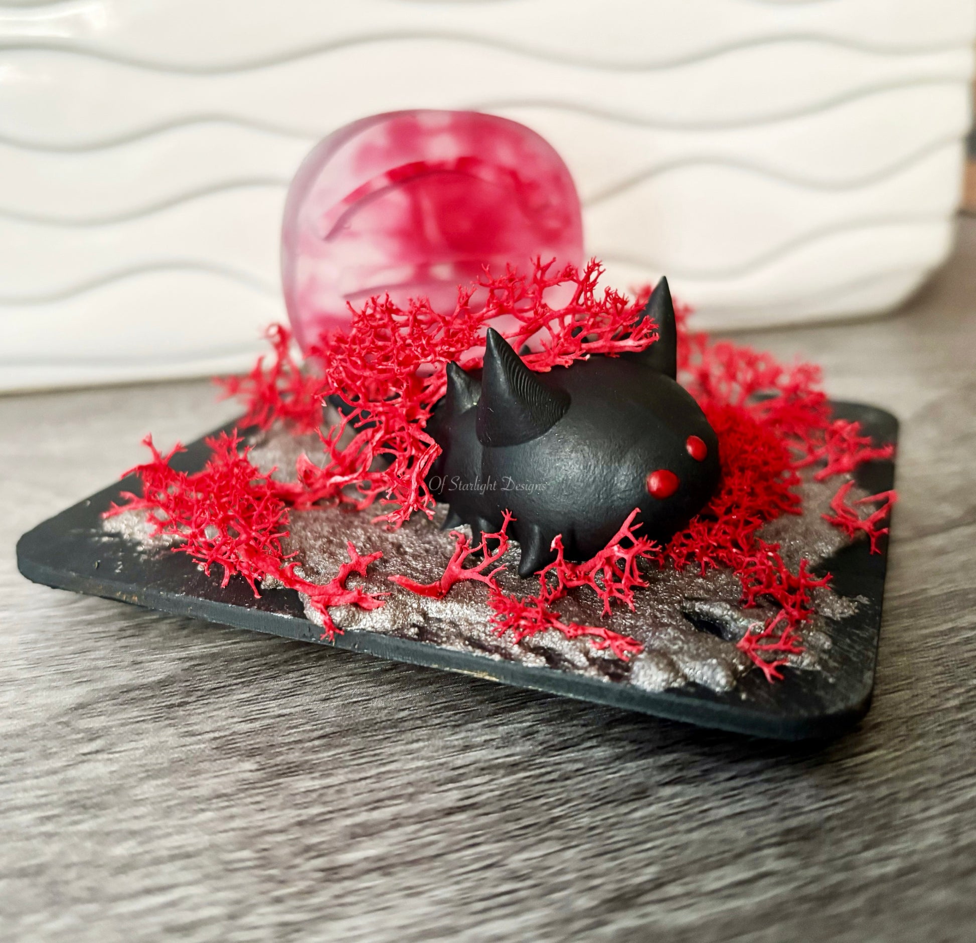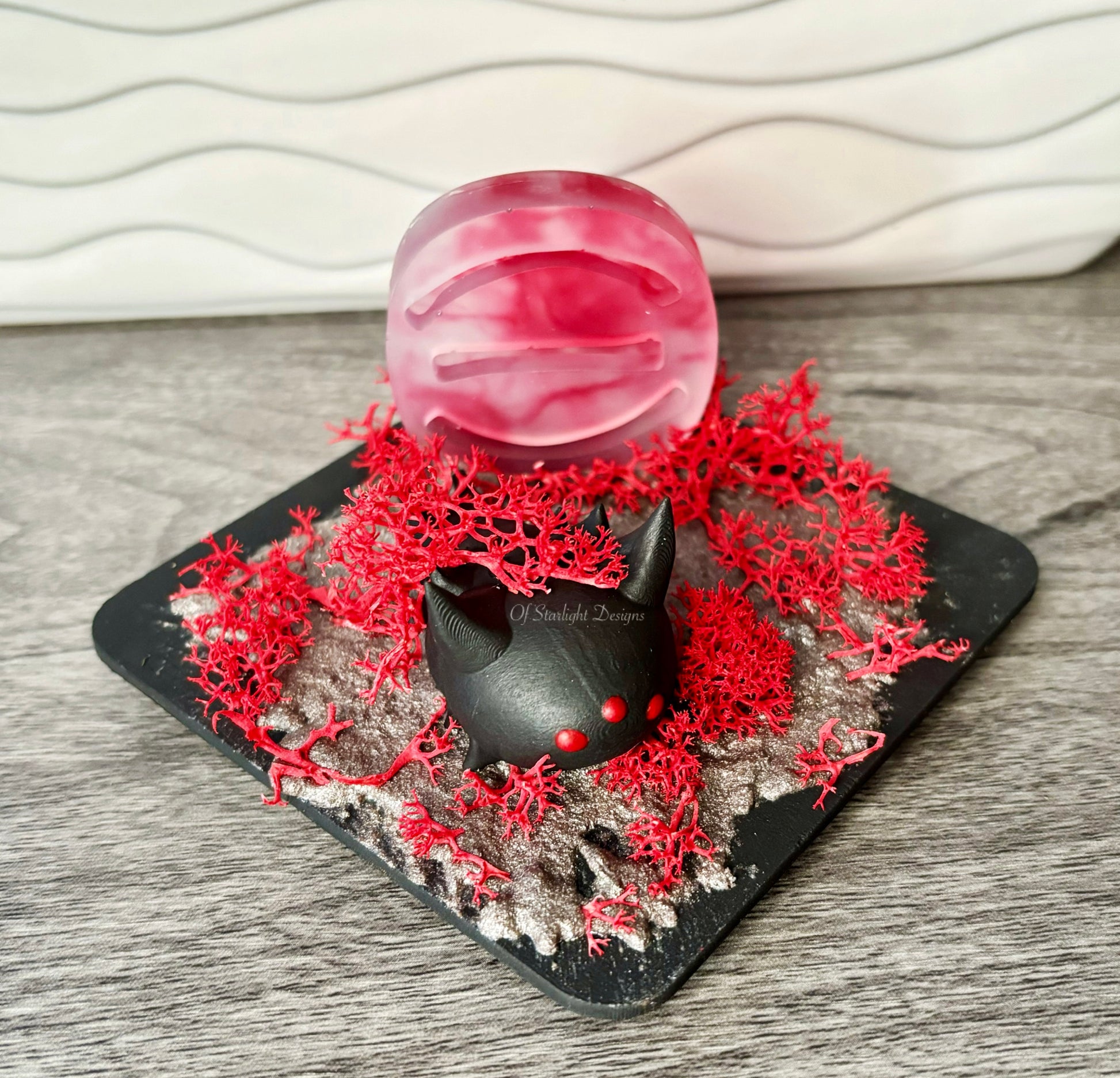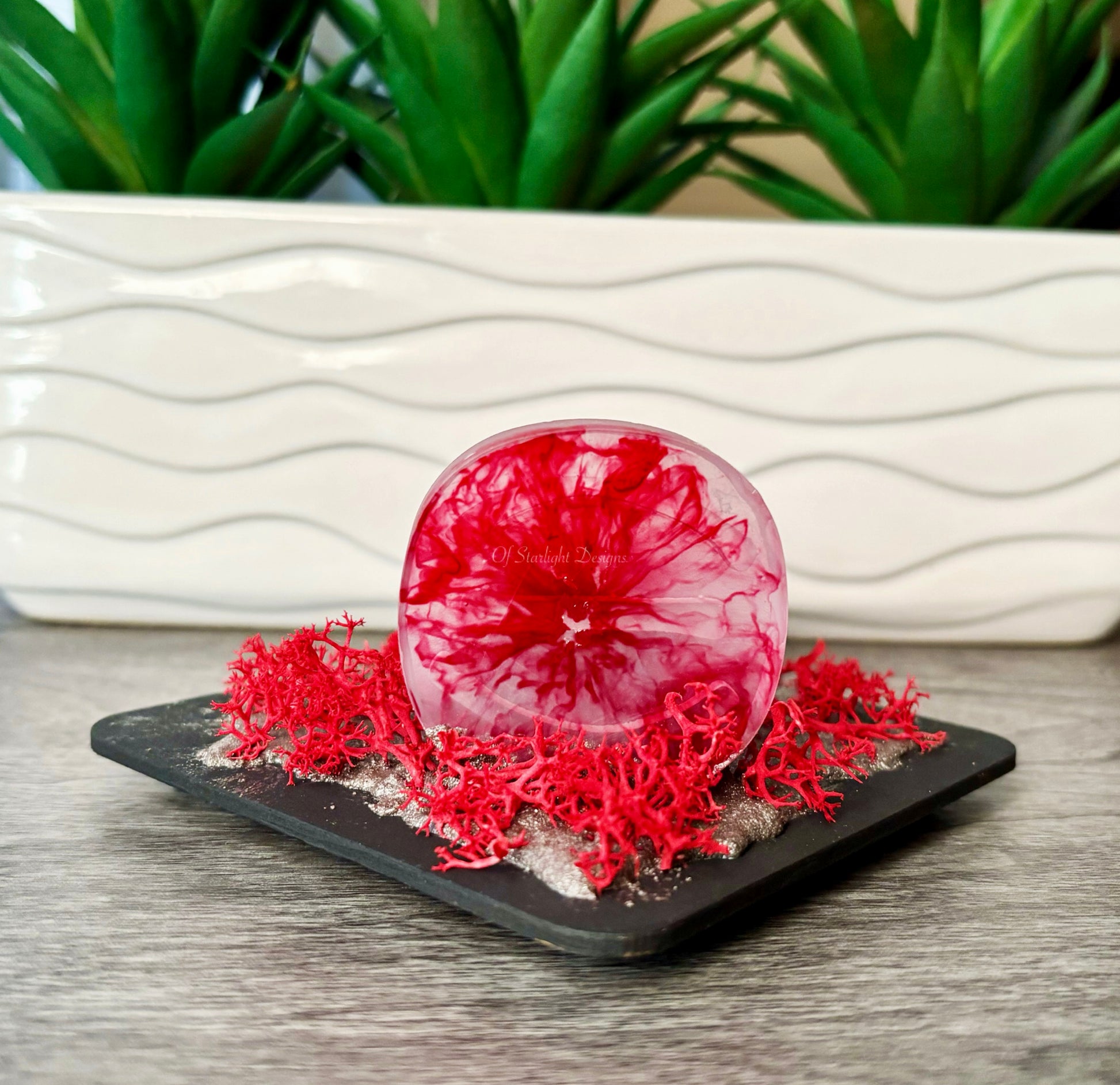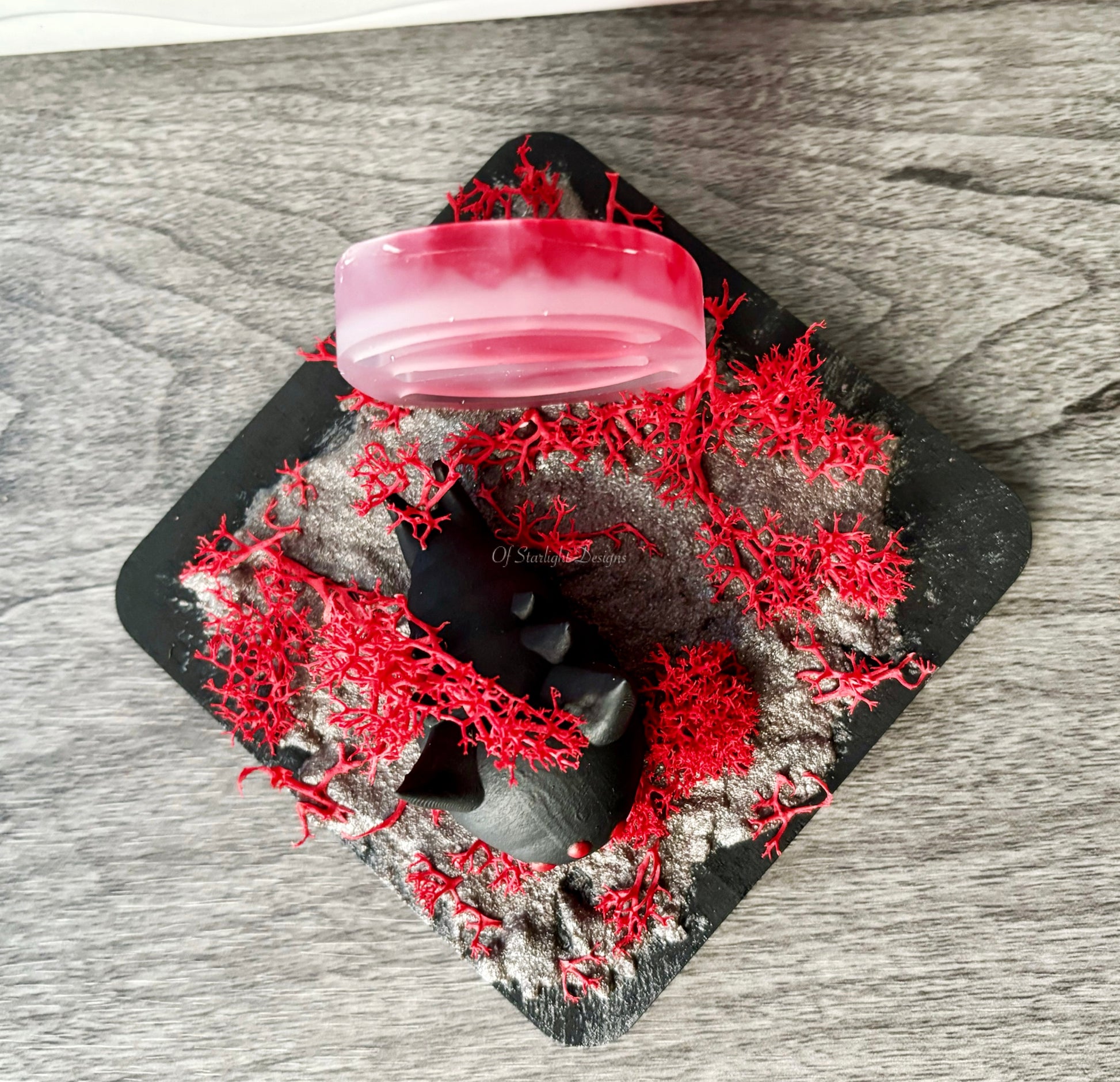 Wooden base with a wormie, faux moss, resin rune, and silver sand mixture on the base.