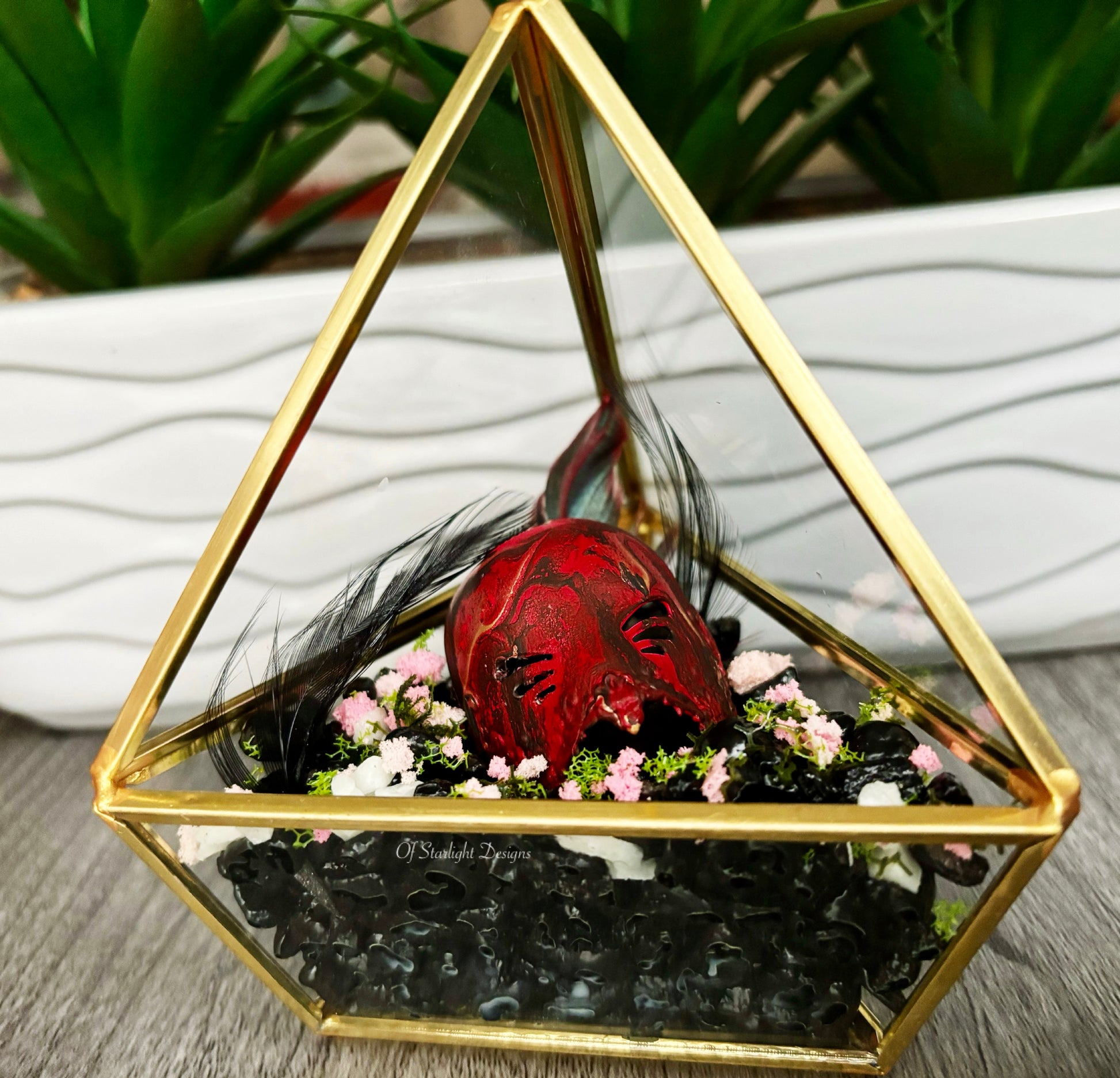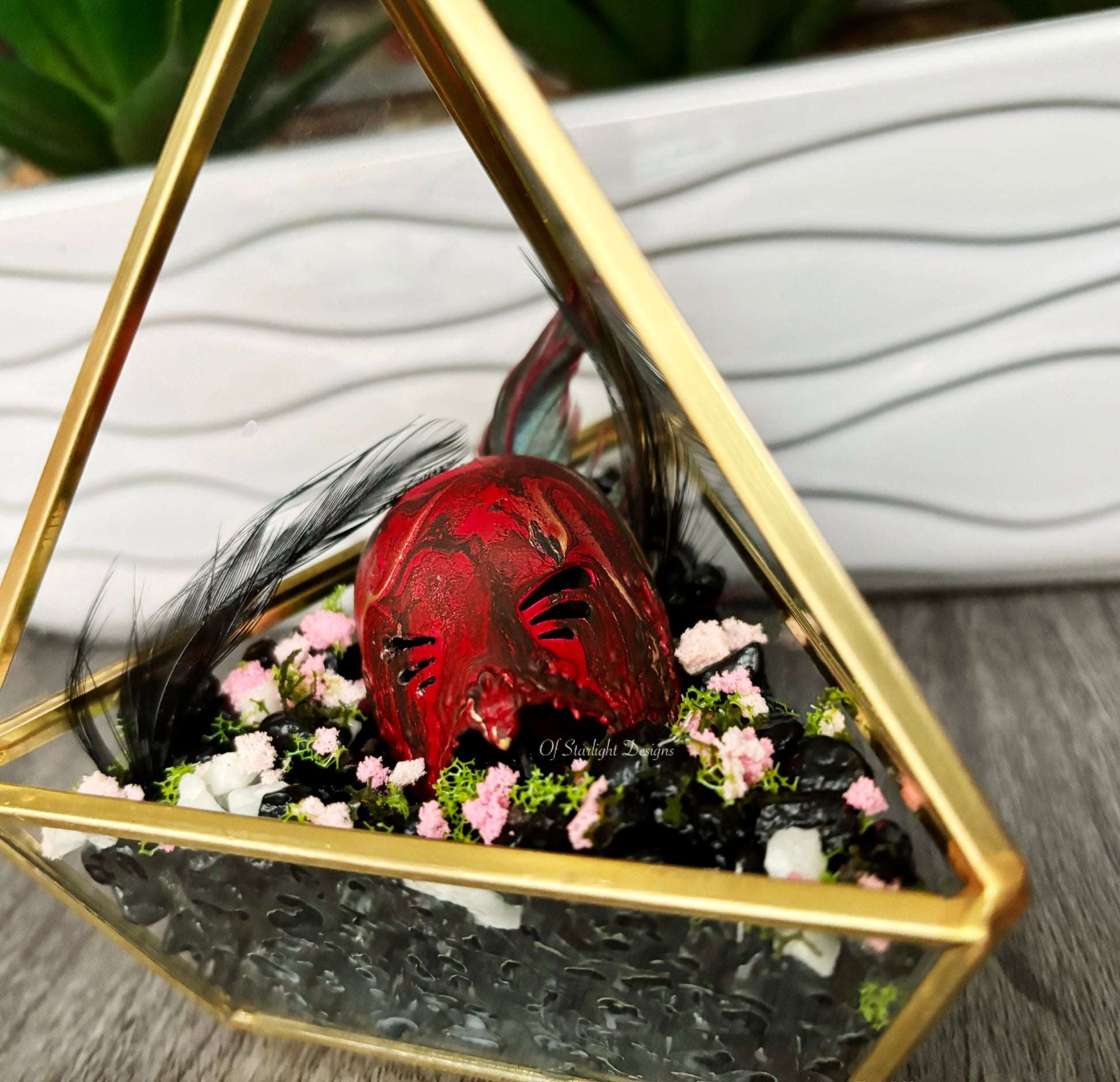 Metal terrarium with glass windows with broken mask, black and red feathers, mini flowers and moss, glow in the dark and black rocks on the base. Everything is glued down to prevent movement.