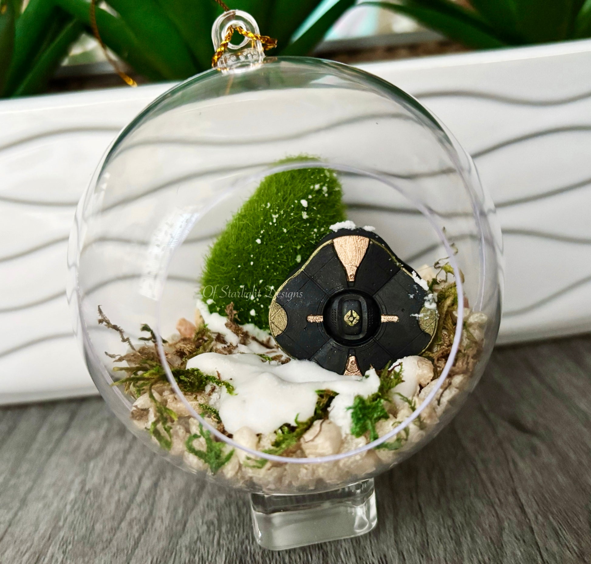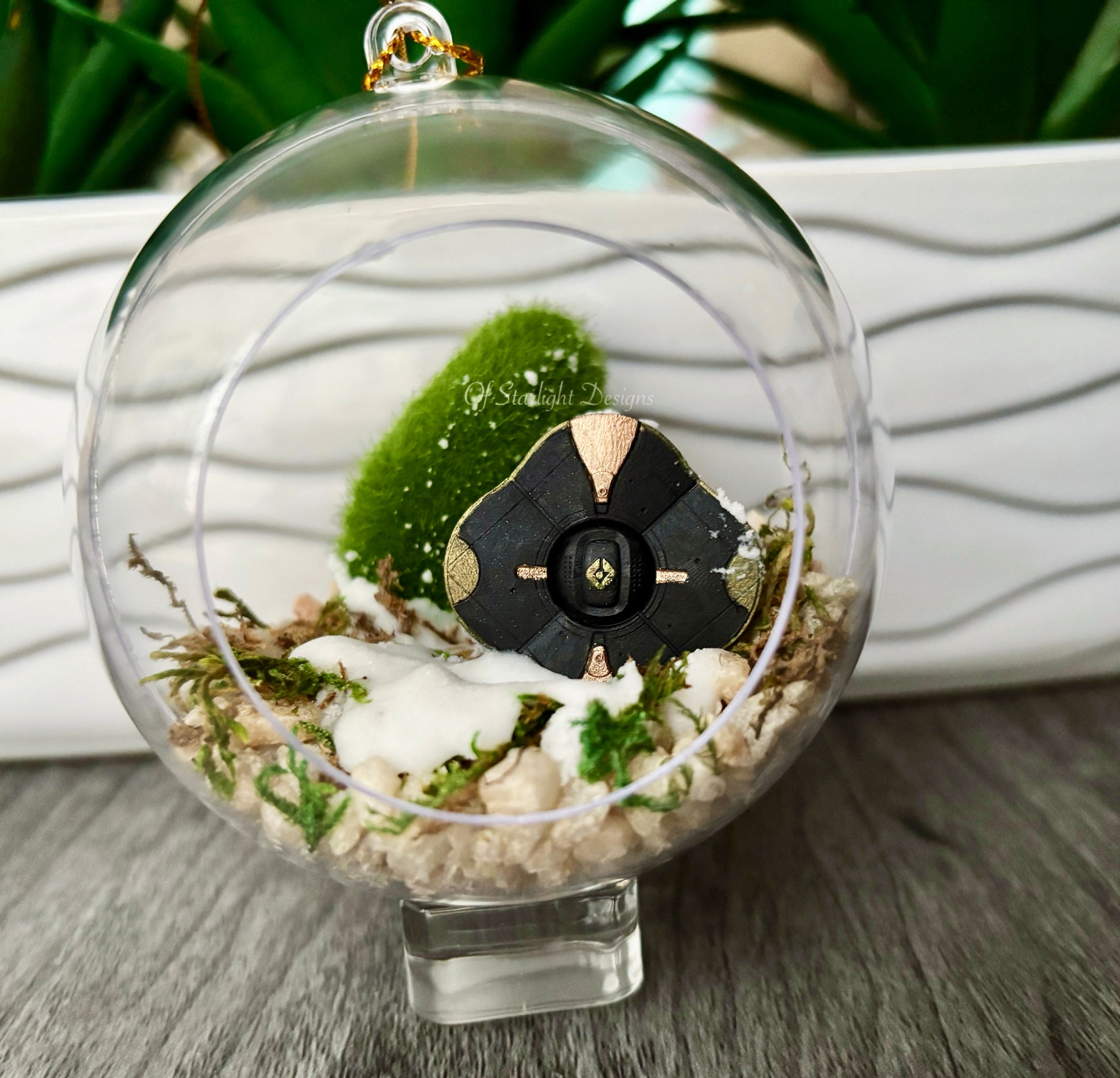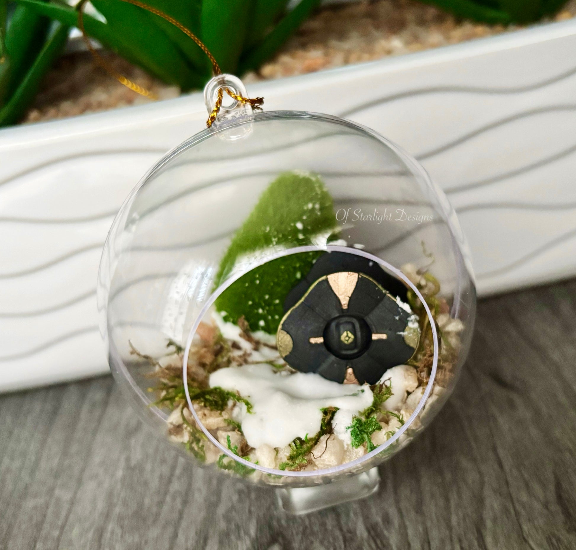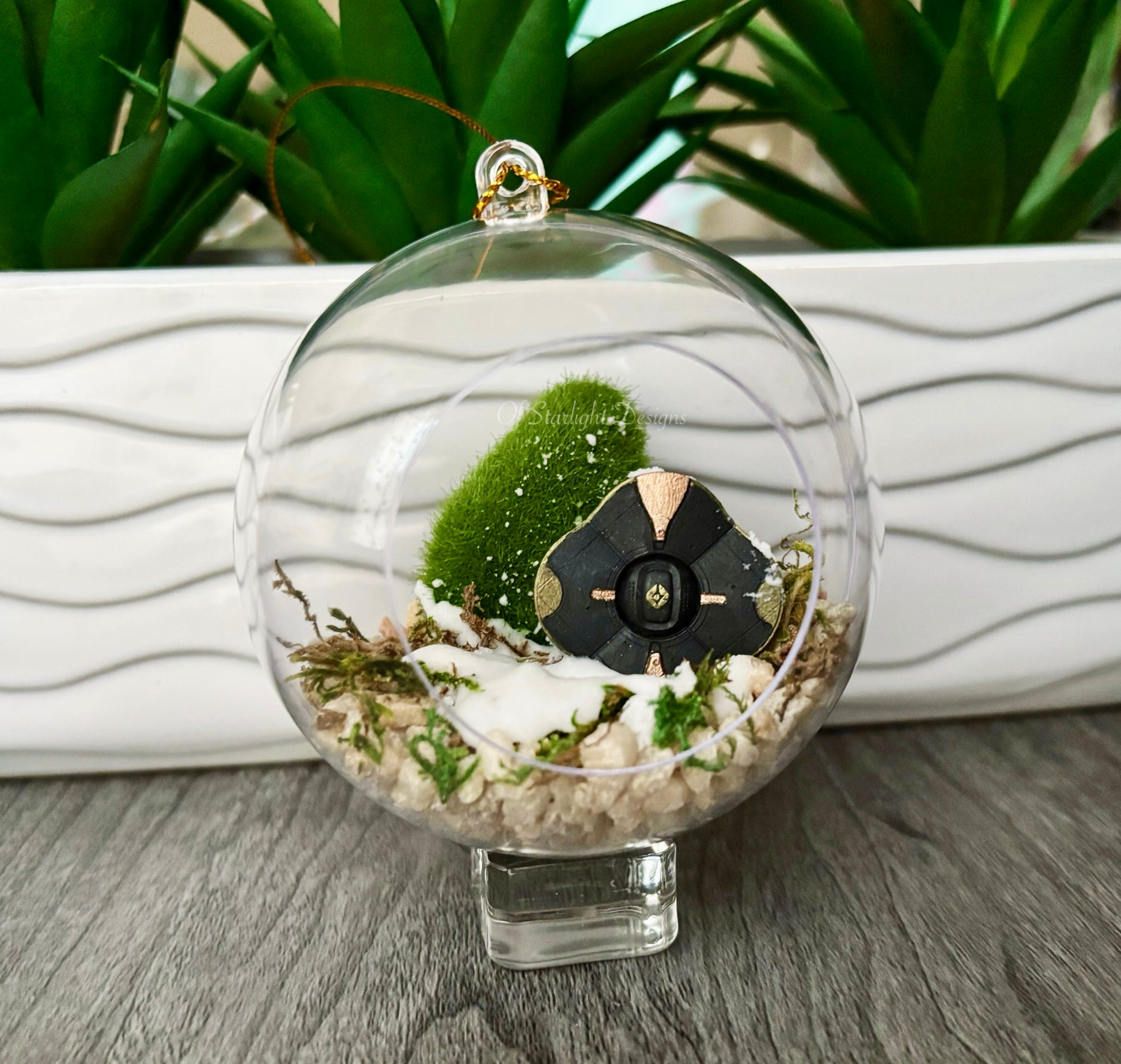 Premium acrylic orb with a starmap little light, white sand to look like snow, moss rock with "snow", moss, tan rocks in the base. Everything is bonded down to prevent movement. Gold string to hang with and glued shut.